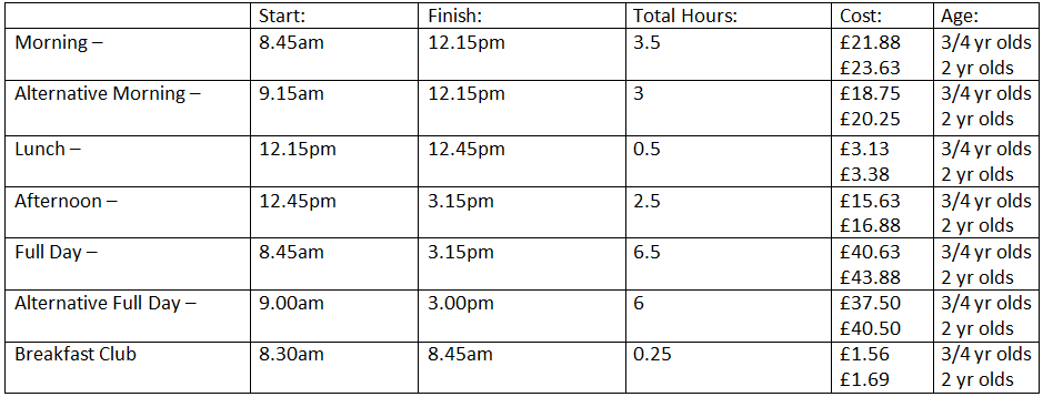 Sessions are charged at £6.25 per hour for 3/4year olds and £6.75 per hour for 2 year olds (until the term after they turn 3)*.
